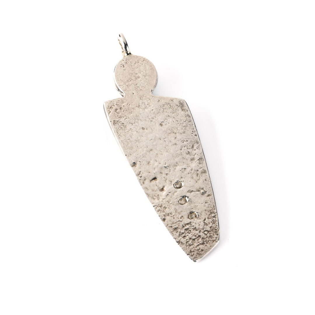 Sterling silver tufa-cast figural pendant with inlaid turquoise head, featuring a dragonfly, water, and star motif.