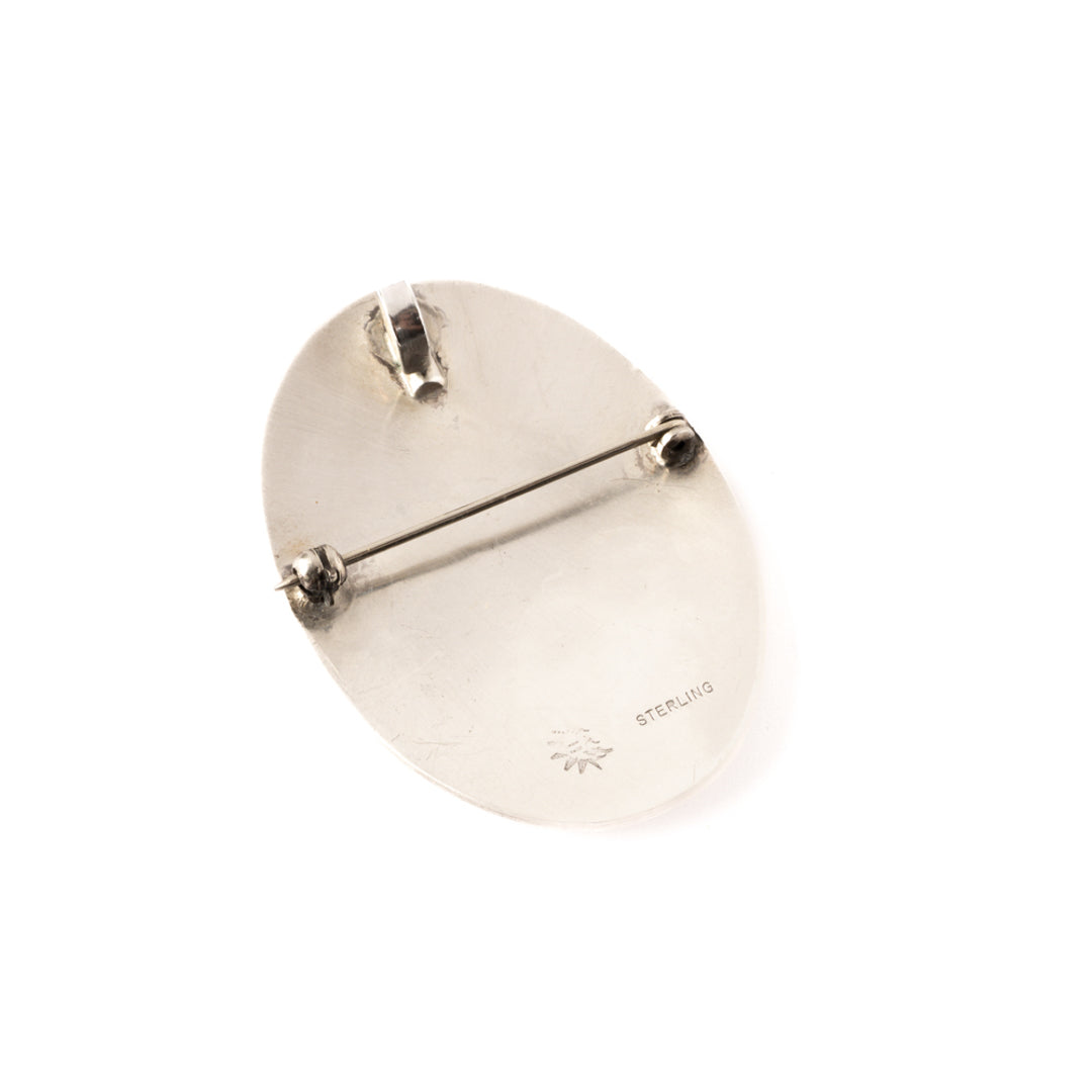 Sterling silver overlay pin/pendant depicting Kokopelli and prayer feathers.