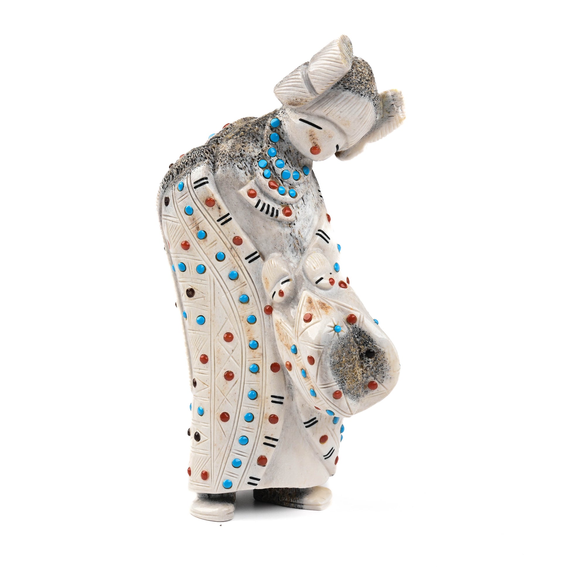 Large, Corn Maiden fetish carved from antler with inlaid jet eyes and wearing a necklace made of turquoise. Decorated with turquoise, coral, and jet. Maiden is holding two corn maiden infants.