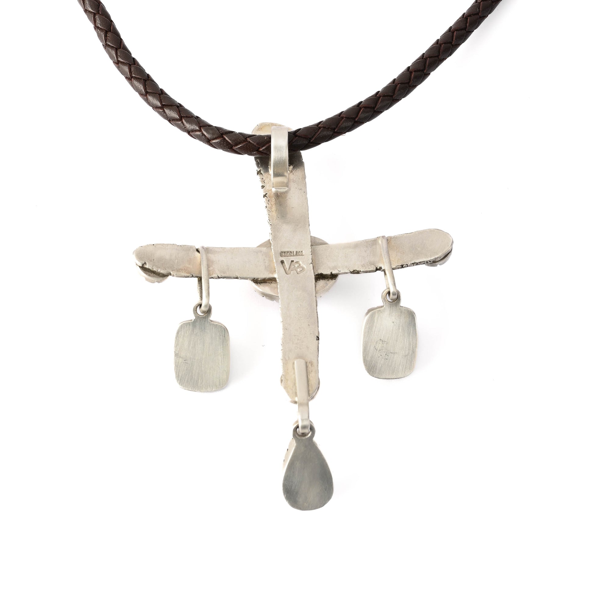 Sterling silver "Navajo Star" pendant on braided black leather lanyard. Star pattern is based on the design found in Navajo Chief Blanket weavings. Stones include two dangling pieces of onyx, four pieces of green jade at the ends of the star's arms, a centrally-mounted piece of red carnelian, and a sky-blue, teardrop-shaped turquoise stone. Sterling silver clasp is handmade.
