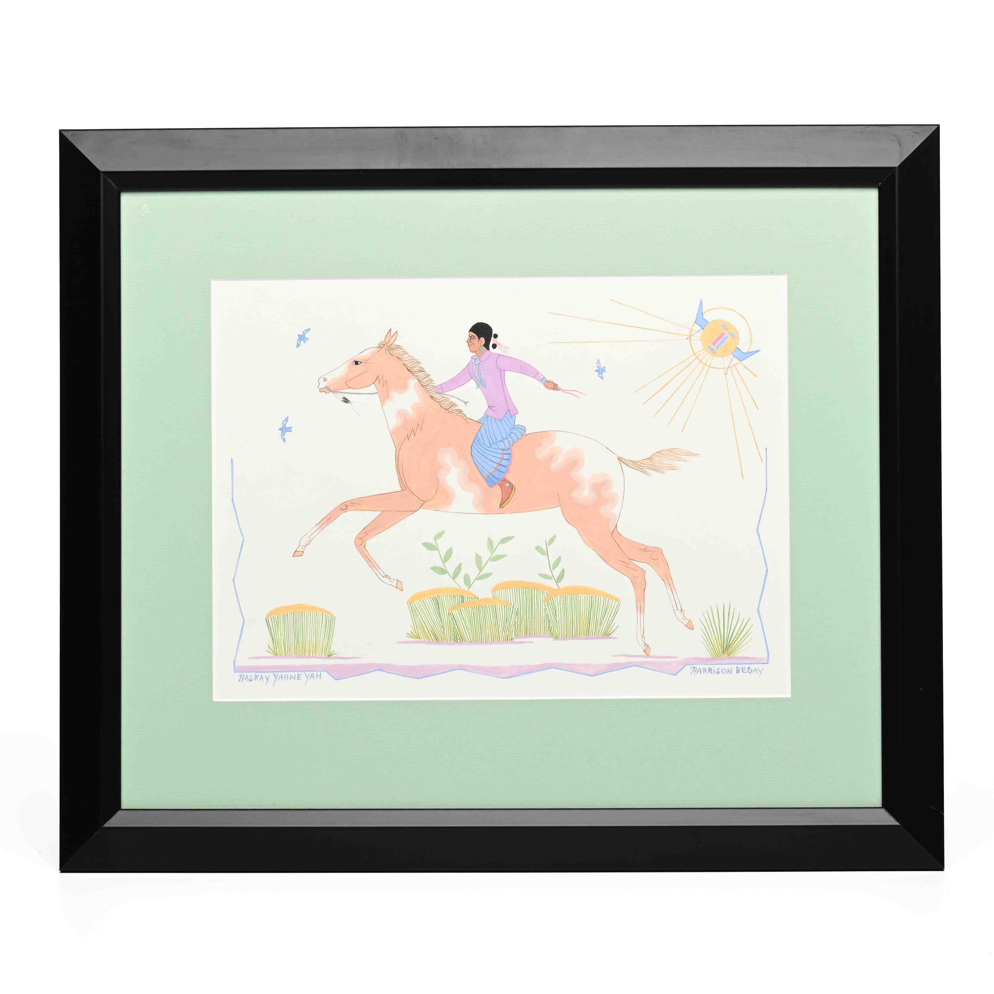 Vintage original gouache painting of a young Navajo woman riding horse.