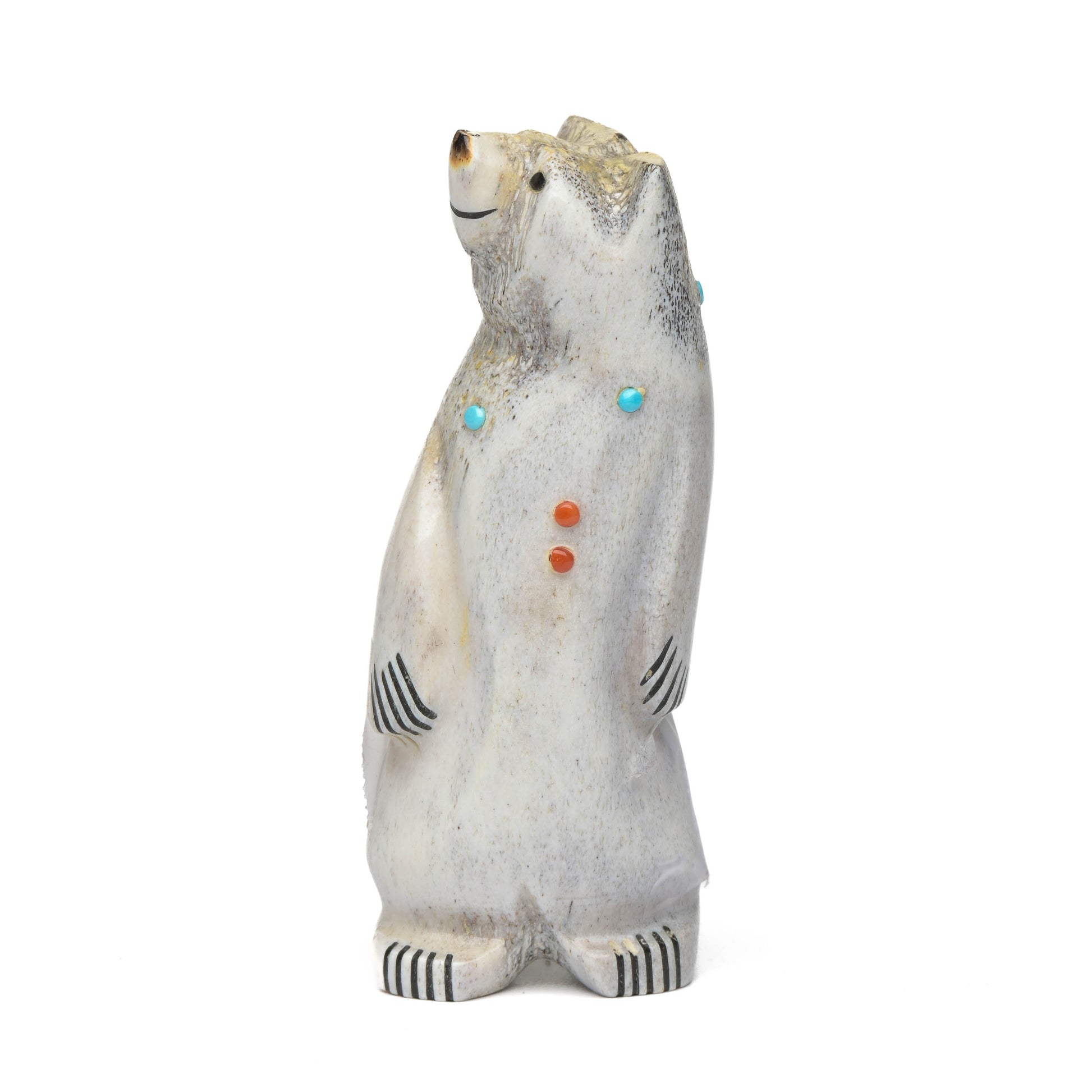 Standing bear fetish carved from antler with eyes, nose, and mouth made from inlaid jet and decorated with appliqued coral and turquoise.